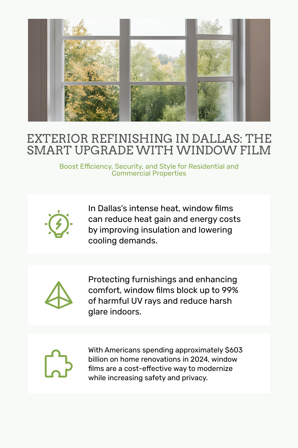 - Decorative Films: Perfect for adding style or branding elements without permanent alterations. Learn more about our [decorative films](https://www.dallaswindowfilm.com/decorative-window-film/).